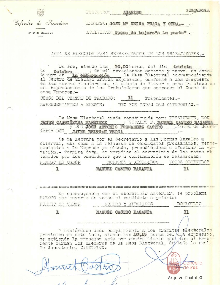 Acta de elección de representante dos traballadores da embarcación Agarimo