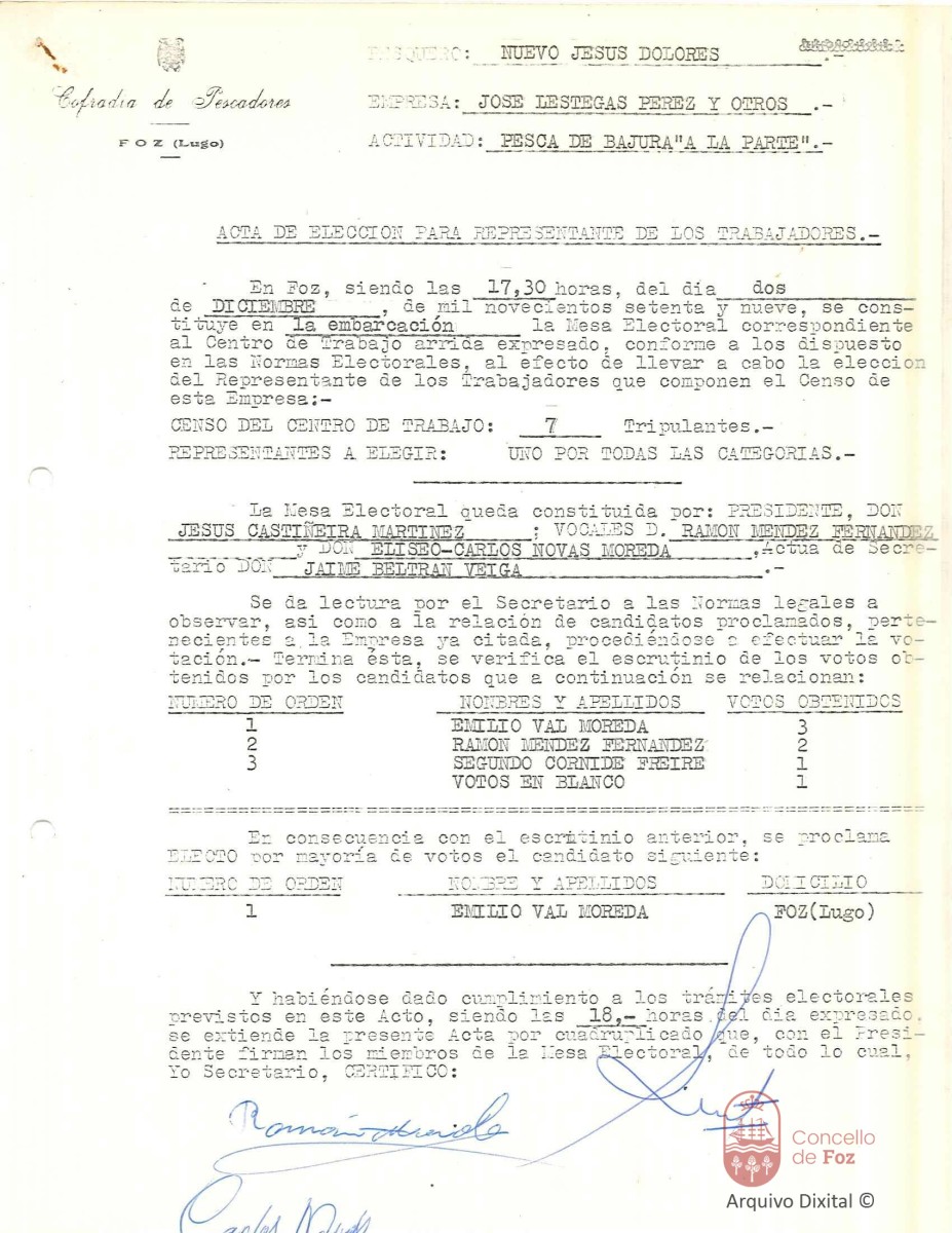 Acta de elección de representante dos traballadores do barco Nuevo Jesús Dolores
