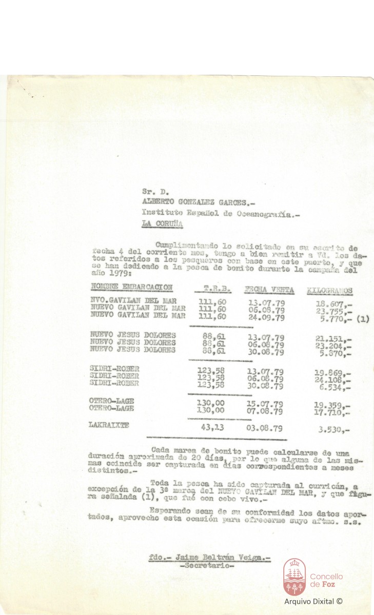 Relación de barcos pesqueiros, con base no porto de Foz que se dedicaron á captura do bonito durante a campaña 1979
