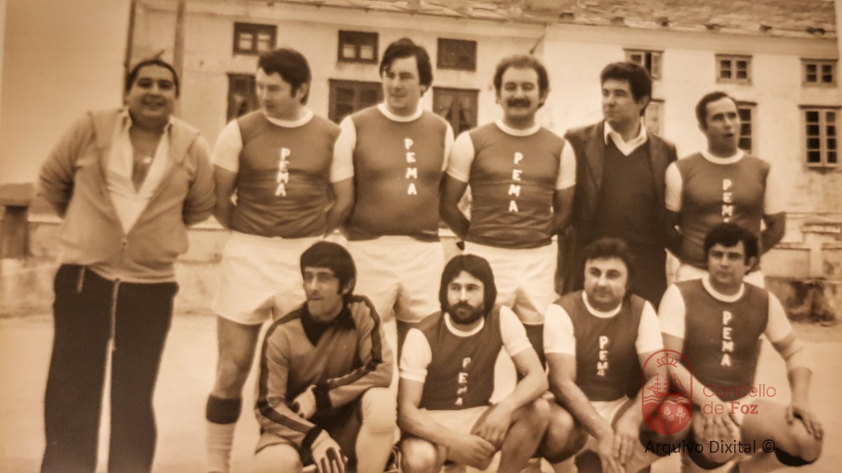 Fila de enriba: Manuel Rodríguez do Pema, Chona, Piñéiro, Manolo López (López de Facenda), Jesús Fiallega, Emilio Rodríguez (Milucho).