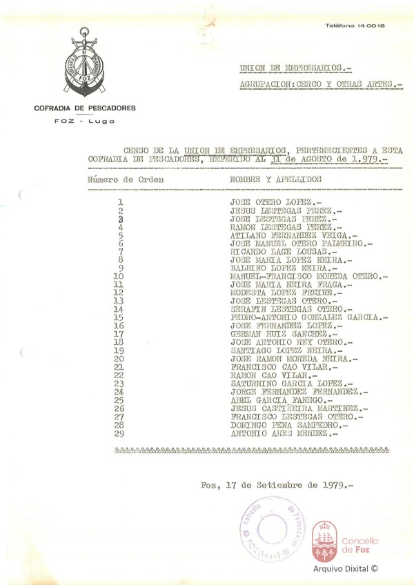 Censo de Unión de empresarios pertencentes á Cofradía de Pescadores de Foz Cofradía de Pescadores