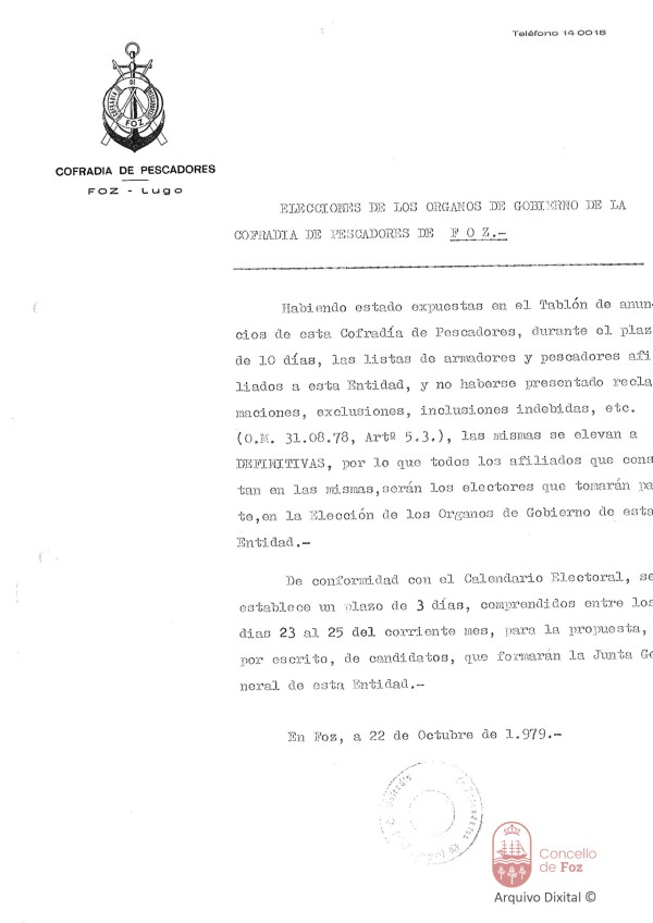 Eleccións 1979. Censo da Unión de traballadores pertencentes á Cofradía de Pescadores de Foz Cofradía de Pescadores