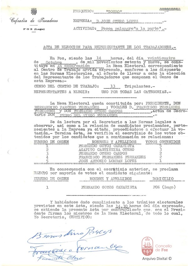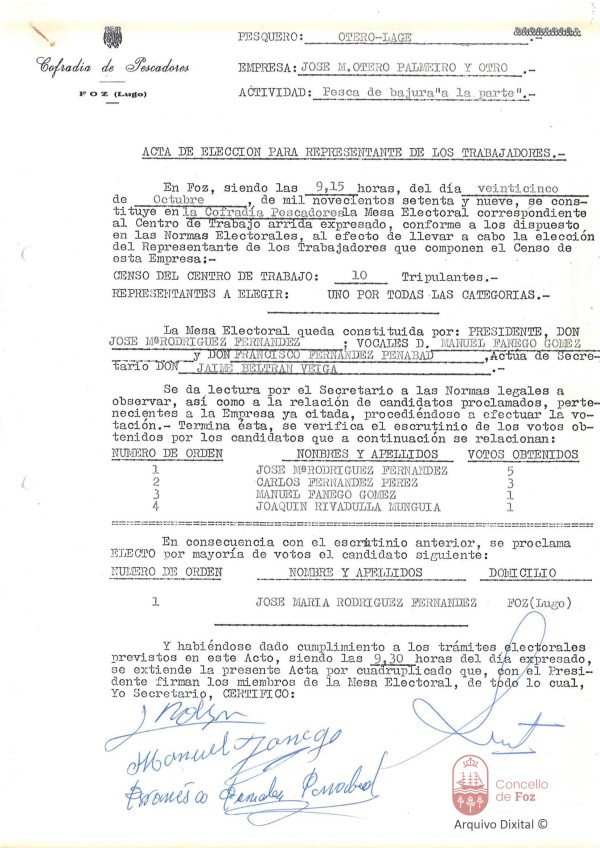Acta de elección do representante dos traballadores da embarcación Otero-Lage Cofradía de Pescadores