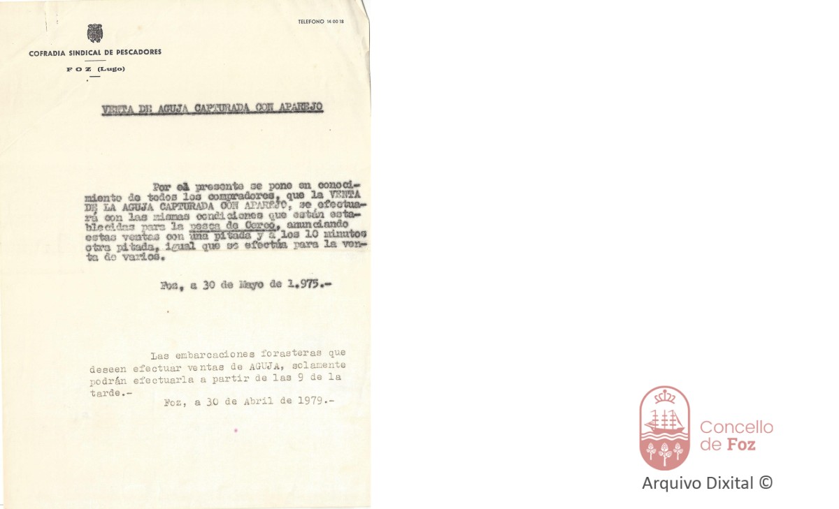 Documento sobre a venda de agulla capturada con aparello