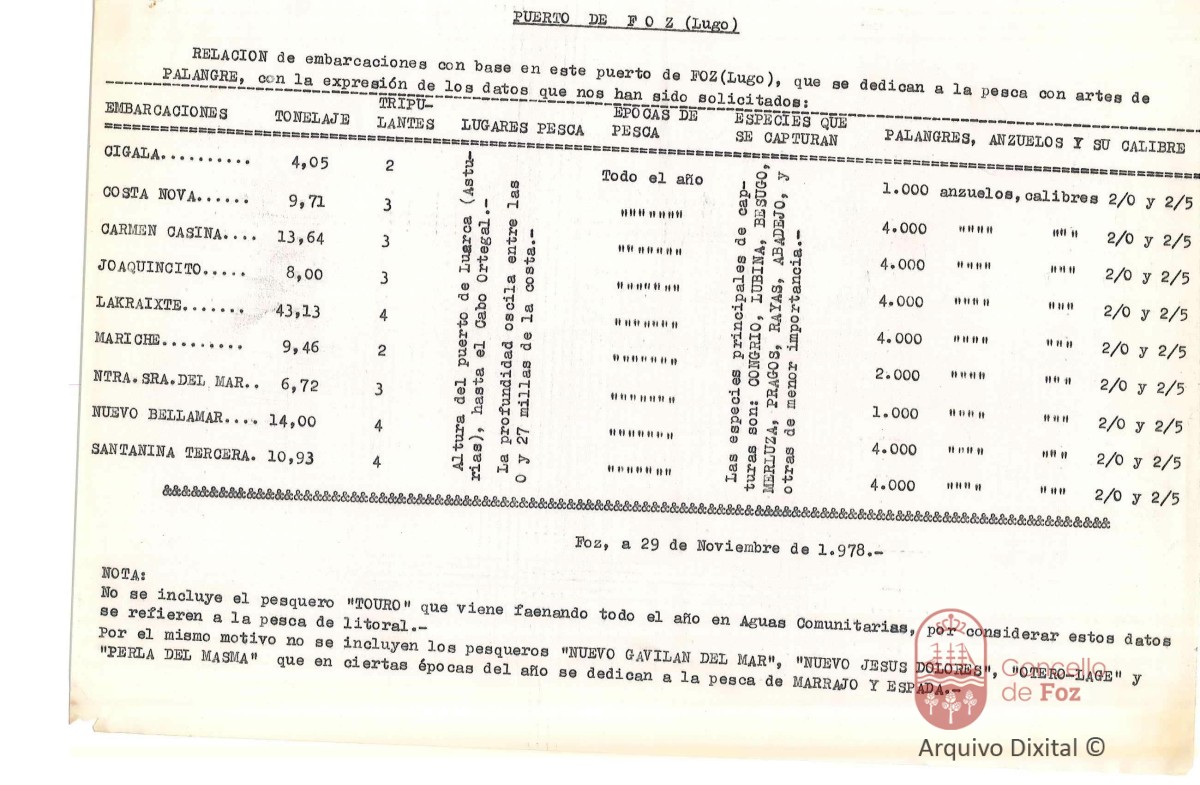 Relación de embarcaciones con base no Porto de Foz dedicados á pesca con arte de palangre.
