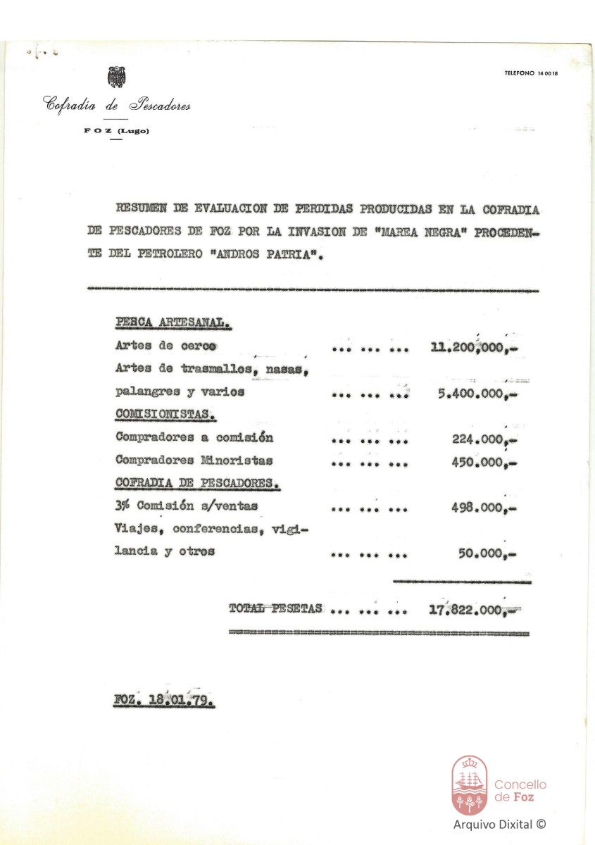 Resumo da avaliación de pérdidas causadas na Cofradía de Pescadores pola marea negra ocasionada polo petroleiro ANDROS-PATRIA.