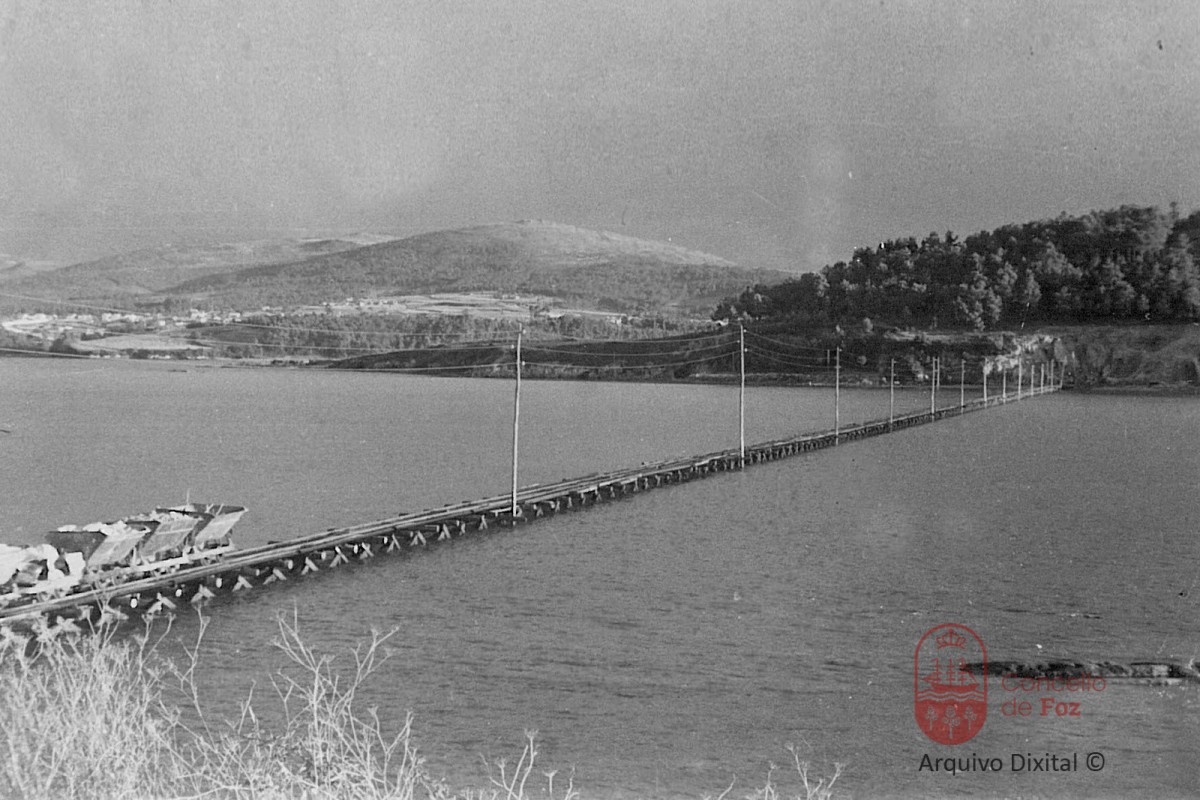En 1952, colocouse unha ponte de madeira con raís, para traer pedra extraída desta punta, para a construción da explanada portuaria. Data da foto 28 de abril de 1952.