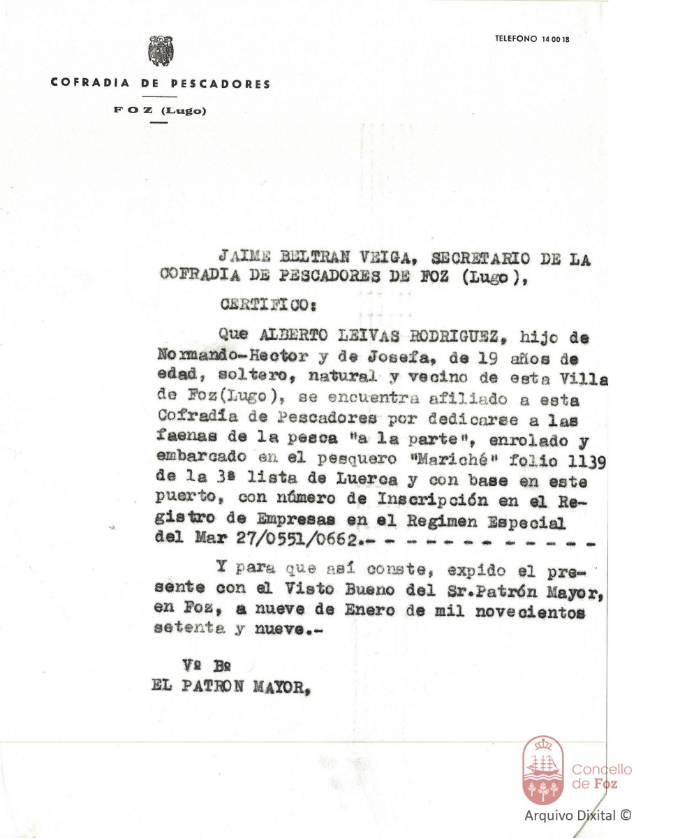 Certificado de afiliación de Dn. Alberto Leivas Rodríguez.
