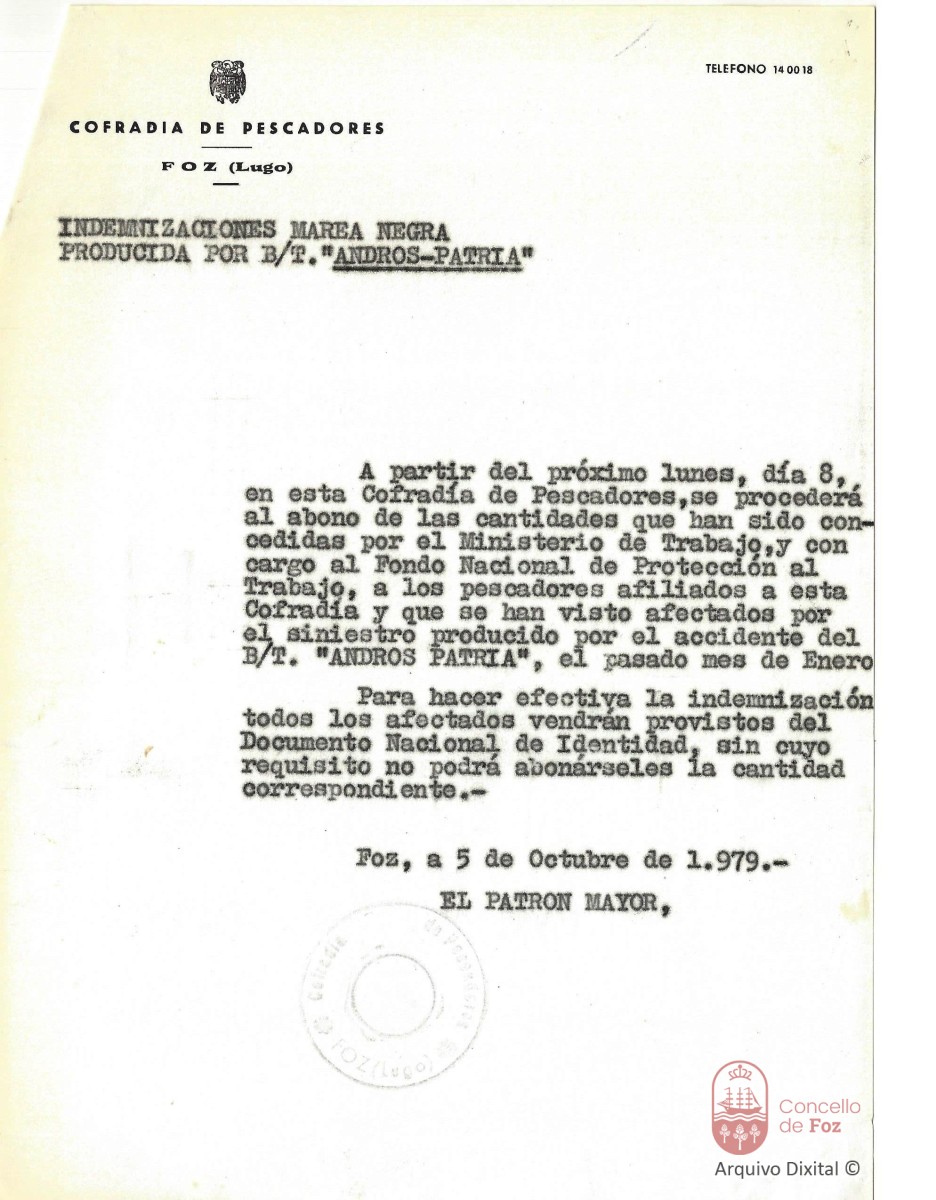 Escrito do Patrón Maior sobre as indemnizacións pola marea negra causada polo petroleiro Andros-Patria