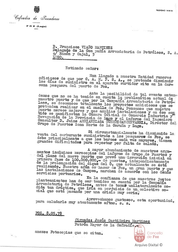 Escrito do Patrón Maior a CAMPSA Cofradía de Pescadores