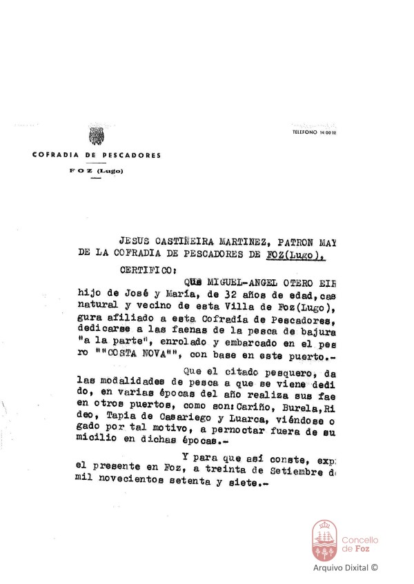 Certificado de afiliación de Ramón Moreda Neira Cofradía de Pescadores