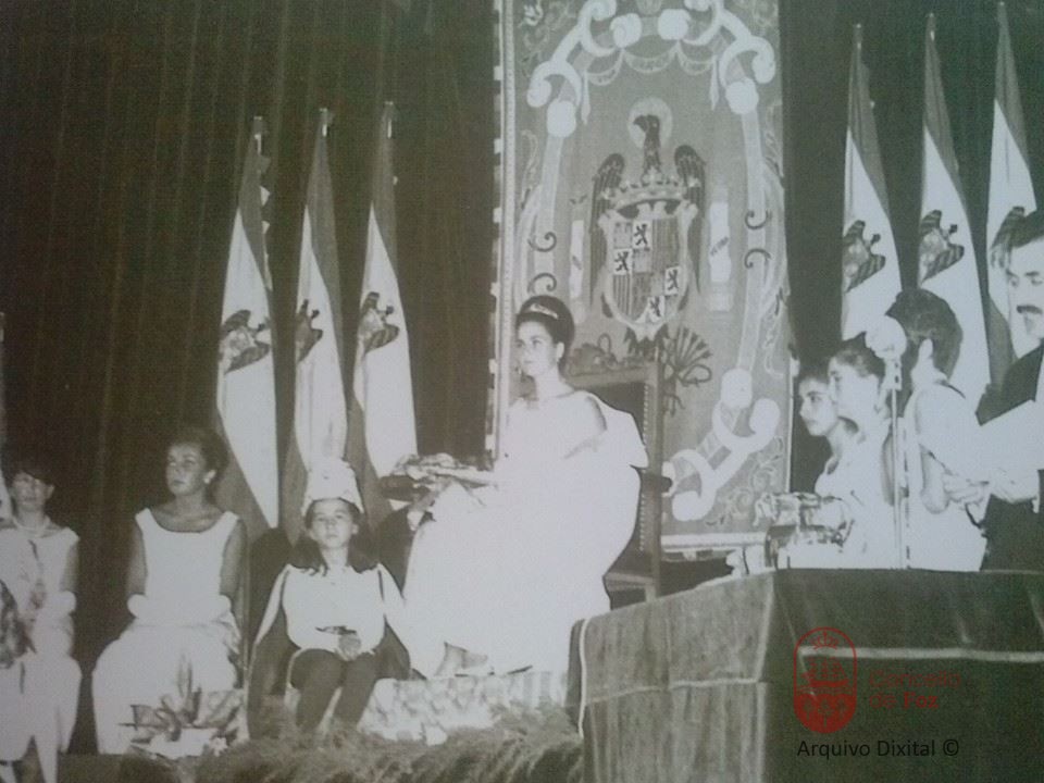 A raiña era Xusta Alonso (de Dn. Benito). A nena sentada a esquerda da raiña é María Elena Beltrán. Lendo á dereita Manuel María.