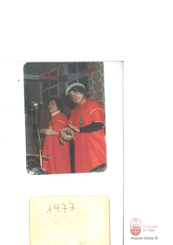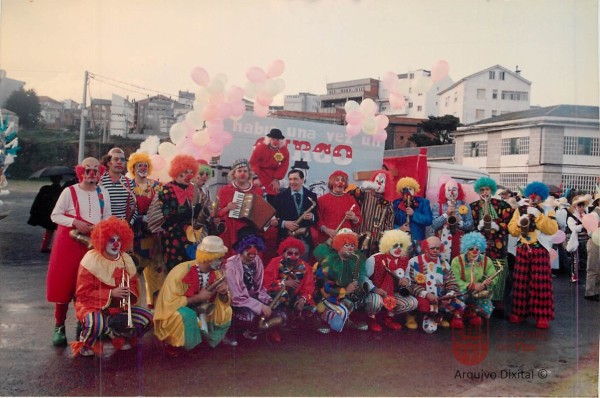 Entroido. Pernas do Centiño disfrazados de paiasos da tele. Festas