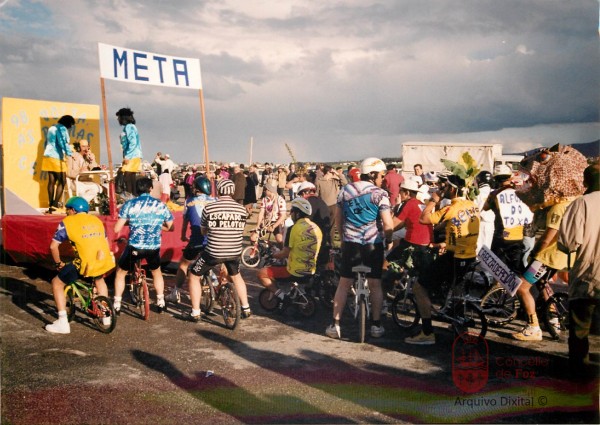Entroido. Pernas do Centiño disfrazados de volta ciclista. Festas