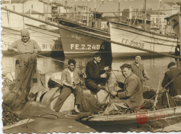 Redeira e mariñeiros amañando as redes Mulleres e o mar