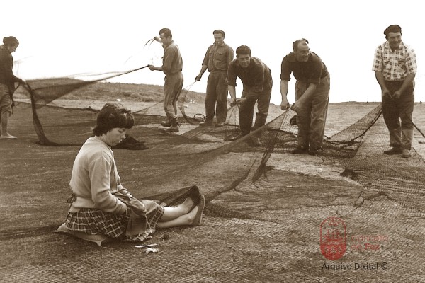 Redeira e homes paneando as redes Mulleres e o mar