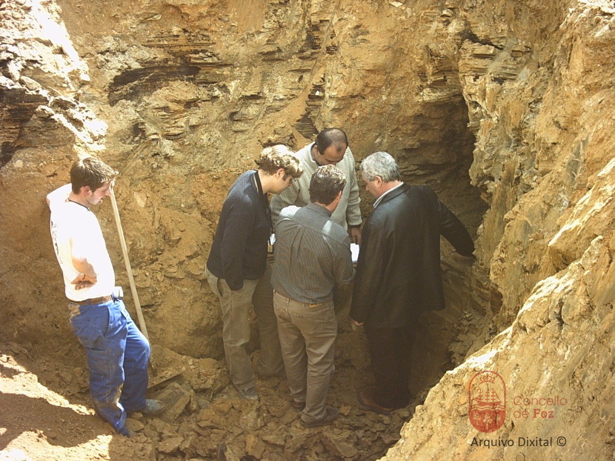 Nesta foto, podemos ver a José María García Rivera, "alcalde neste momento", xunto con Rafael Marful López (aparellador municipal), ao dono das obras a construir Francisco Luis Fernández López (Culís) e o arqueólogo dos Servizos Técnicos da Delegación Provincial de Cultura, Comunicación Social e Turismo, Xosé Ignacio Vilaseco Vázquez e un obreiro. O arqueólogo deuno por "un achado sen importancia". Segundo a Mariña Patrimonio, tratábase dunha mina de ouro escavada polos romanos.