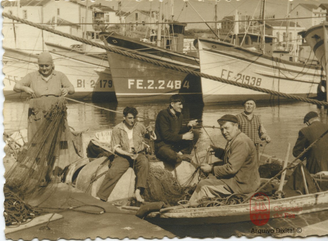 Redeira e mariñeiros amañando as redes