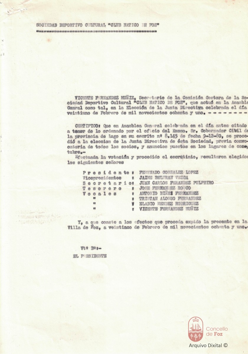 Certificado da primeira Xunta Directiva do Clube Náutico.