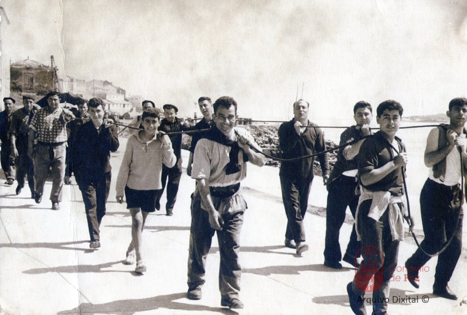 Dotación do Gavilán del Mar tirando polo carro coa rede.
