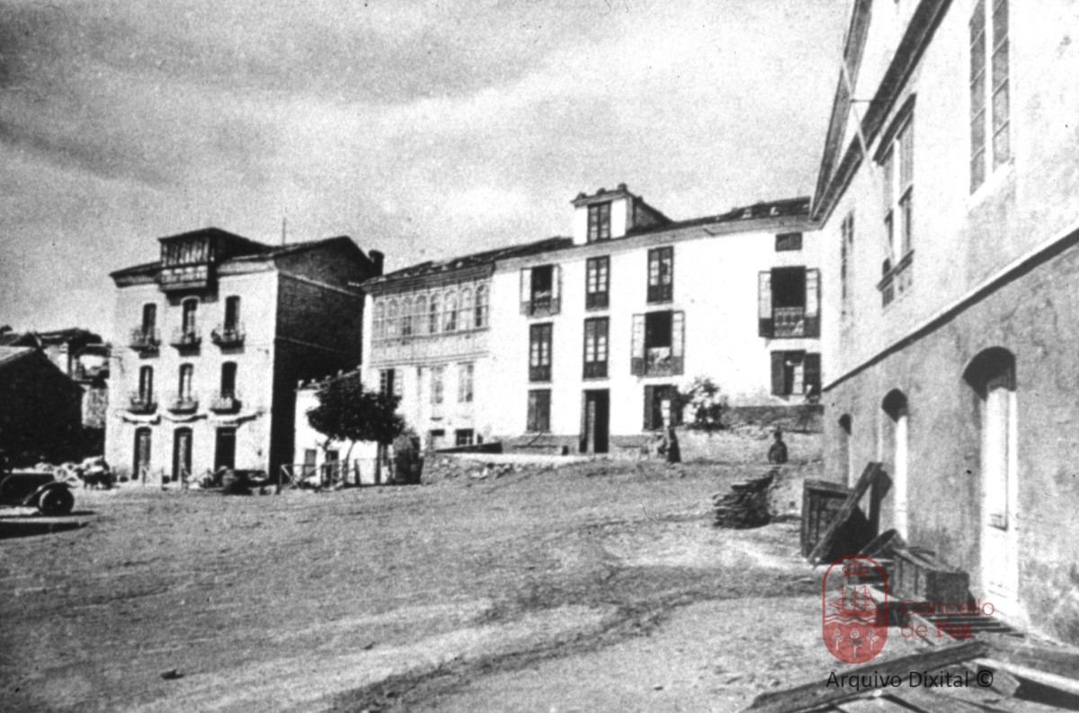 O edificio de enfrente á esquerda era o Xulgado, chamabase a casa "a Viña". O edificio da dereita o Ambigú (era a Sociedade de Socorros Mútuos).