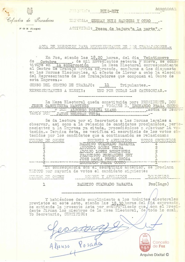 Acta de elección de representante dos traballadores na embarcación Ruíz Rey Cofradía de Pescadores